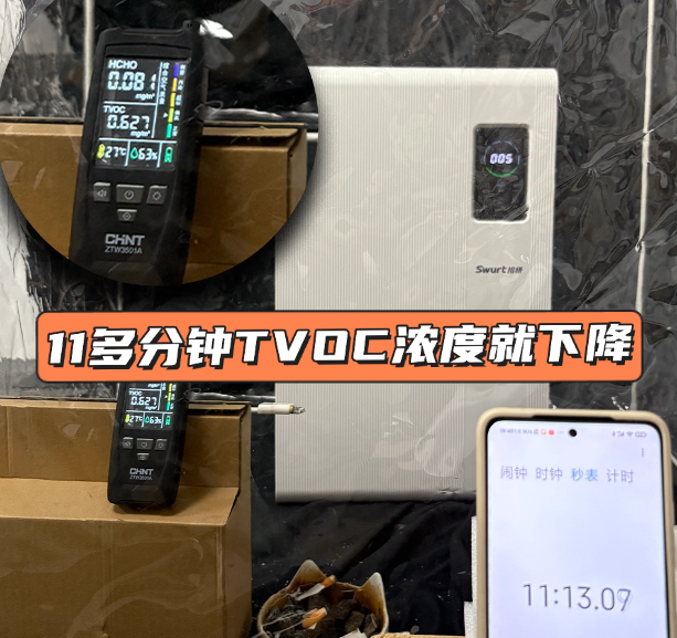 这部分就是为了验证拾梧FW01在典型吸烟场景下,对烟雾及气味的处理效率,特别是TVOC和PM2.5的下降速度。点燃一支香烟,待烟雾均匀扩散后,开启拾梧FW01并记录TVOC初始值为9.999mg/m³。看看净化所需时间。