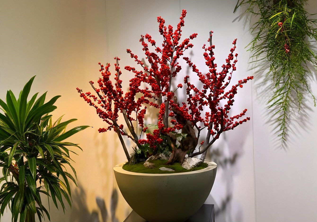 北美冬青绝对是年宵花里的“氛围感担当”,鲜红的果实挂满枝条,像一串串小红灯笼,寓意“金玉满堂、红红火火”,不管是插瓶还是盆栽,都特别有年味。最绝的是它剪枝插瓶后,不用费心养护也能保鲜很久。 北美冬青,放在客厅,可保鲜了22天。养护技巧:剪枝时斜剪45度,增大吸水面积;花瓶里加清水,每3天换一次水,每次换水时再剪一次枝;放在通风、没有阳光直射的地方,避免果实提前脱落;不用加营养液,清水就能保鲜。 买的时候选果实饱满、没有干瘪的枝条,枝条长度选30-40cm的,插瓶更美观。