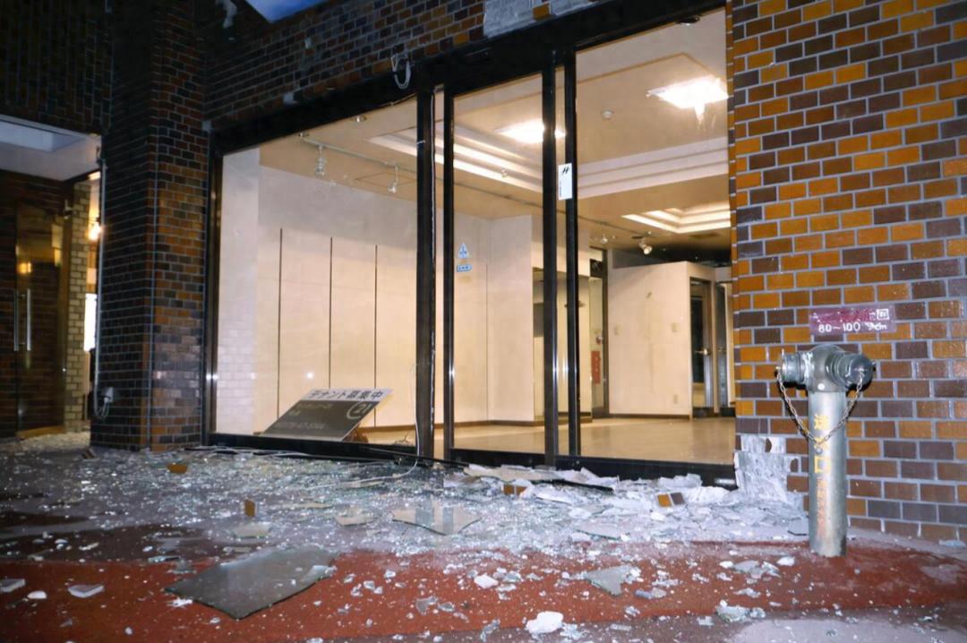 地震后日本青森县八户市道路上散落着玻璃碎片