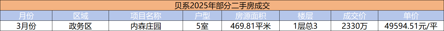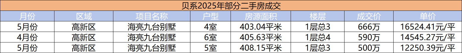 2025年,海亮九台别墅在贝系一共成交了3套,均为400平+房源,单价在1.23万到1.65万不等。