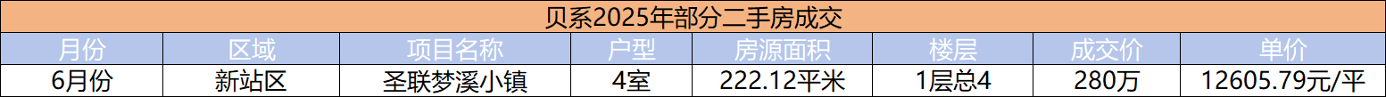 2025年,圣联梦溪小镇别墅在贝系有一套成交,单价1.26万,总价280万。