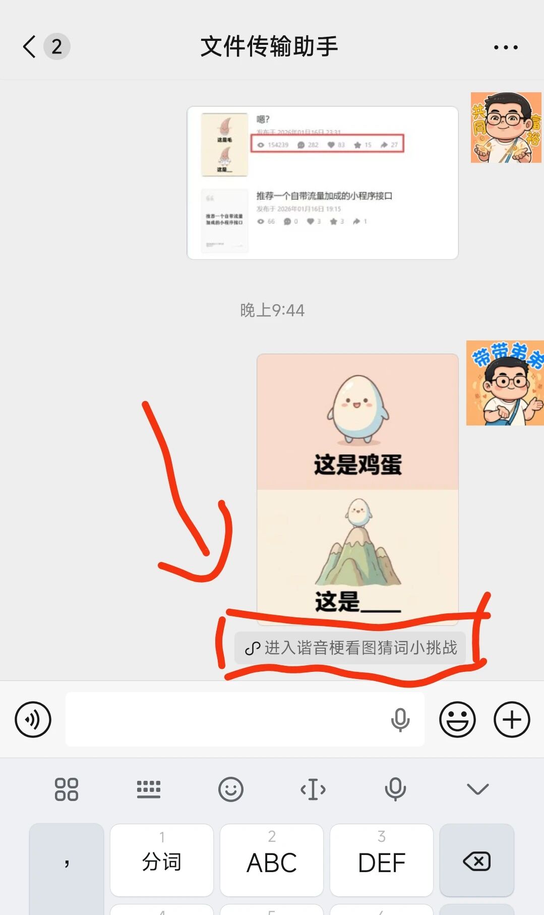 这个接口支持图二多种功能,包括:①转发好友②分享到朋友圈③添加收藏④保存图片⑤发表到公众号其中,①②⑤这三个方式,都支持带入小程序的入口链接,实测①和⑤可以通过该入口进入小程序。图三示例,长按图片即可变为图二样式图四示例,转发好友页面,可以直接跳转小程序图五示例,朋友圈页面可以曝光小程序名称比如,选择功能⑤发表到公众号,就会把图一这张图直接导入公众号图文编辑页,并且在这个图文底部,会有小程序的入口,显示:来自小程序「谐音梗看图猜词小挑战」紧挨着这个入口上面的跳转链接,是复制小程序链接之后,在发表图文消息时,添加至底部的「链接」菜单处。另外,这篇推文还测试了#来微信做个小程序 话题共建计划。根据官方流量扶持说明,添加此话题,即有可能过去小程序专属推广资源(流量扶持)。#来微信做个小程序#谐音谜题挑战 #山峰上的小蛋 #AI#VibeCoding#小程序流量入口 #微信小程序开发 #wx.showShareImageMenu #微信官方接口 #小程序创意展示