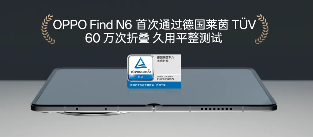 凭借这两大颠覆性技术,OPPO Find N6 成为全球首款通过德国莱茵 TÜV 无感折痕「连续 60 万次折叠测试 久用平整」认证的折叠旗舰,更在该机构的久用测试中,以远超行业常规水平的平整度表现,打破折叠屏平整测试历史纪录,成为德国莱茵 TÜV 实验室测试过的「全球最平整折叠手机」。