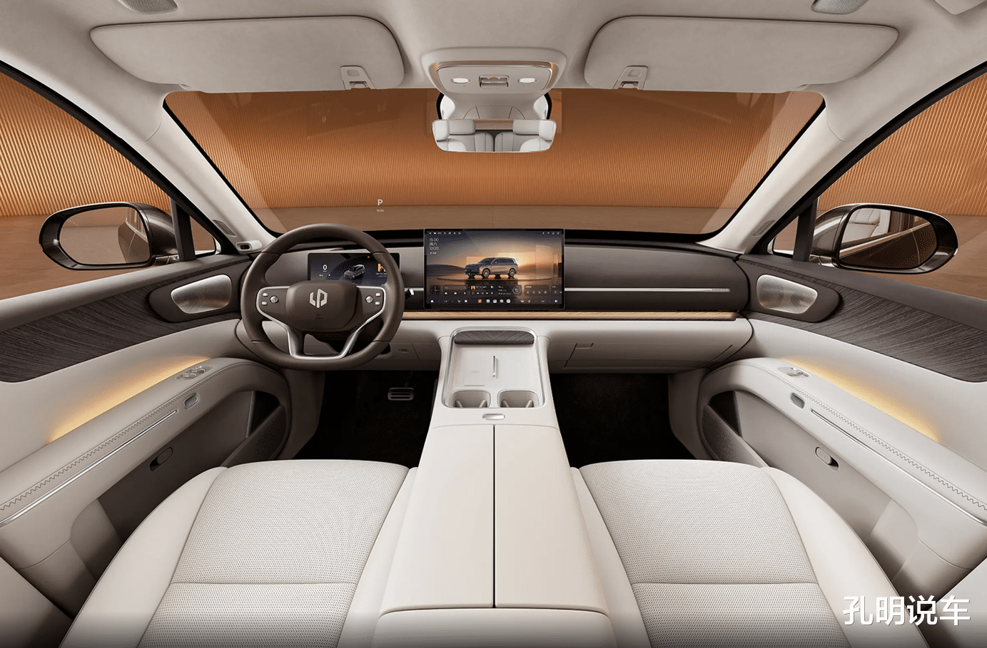 关键是近日总算给出了车内的定妆照,能够感觉到这款车是有豪华氛围的,前排直接选择了简约的悬浮车机大屏幕,不过细节上可以看到很真实的木纹装饰面板以及更精致的漫反射氛围灯。