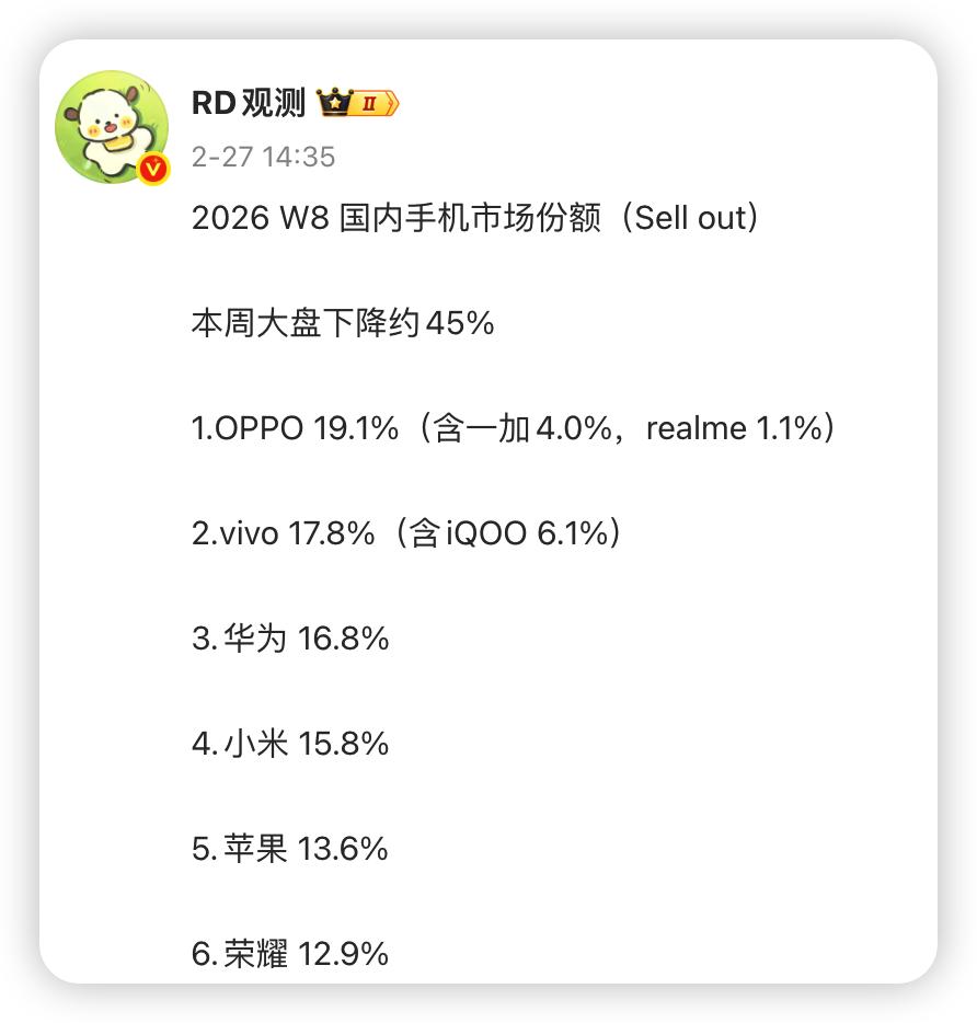 那么问题来了,既然iQOO没有受到什么影响,而国内的手机市场又是存量竞争为主,那么这波竞争下来到底谁最受伤呢?