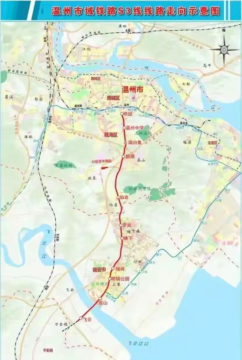 而S3号线也是大家关注的重点,一期长33.2公里,有11个站点,从瓯海梧田到瑞安飞云,设计时速120公里,建好后可以转乘S1、S2号线,到时瑞安跟温州主城通勤时间大概一个小时左右。现在S3号线建设得很顺利,其中瑞安段的关键工程计划2025年年底完工,整一条线路大概在2027年可以通车。