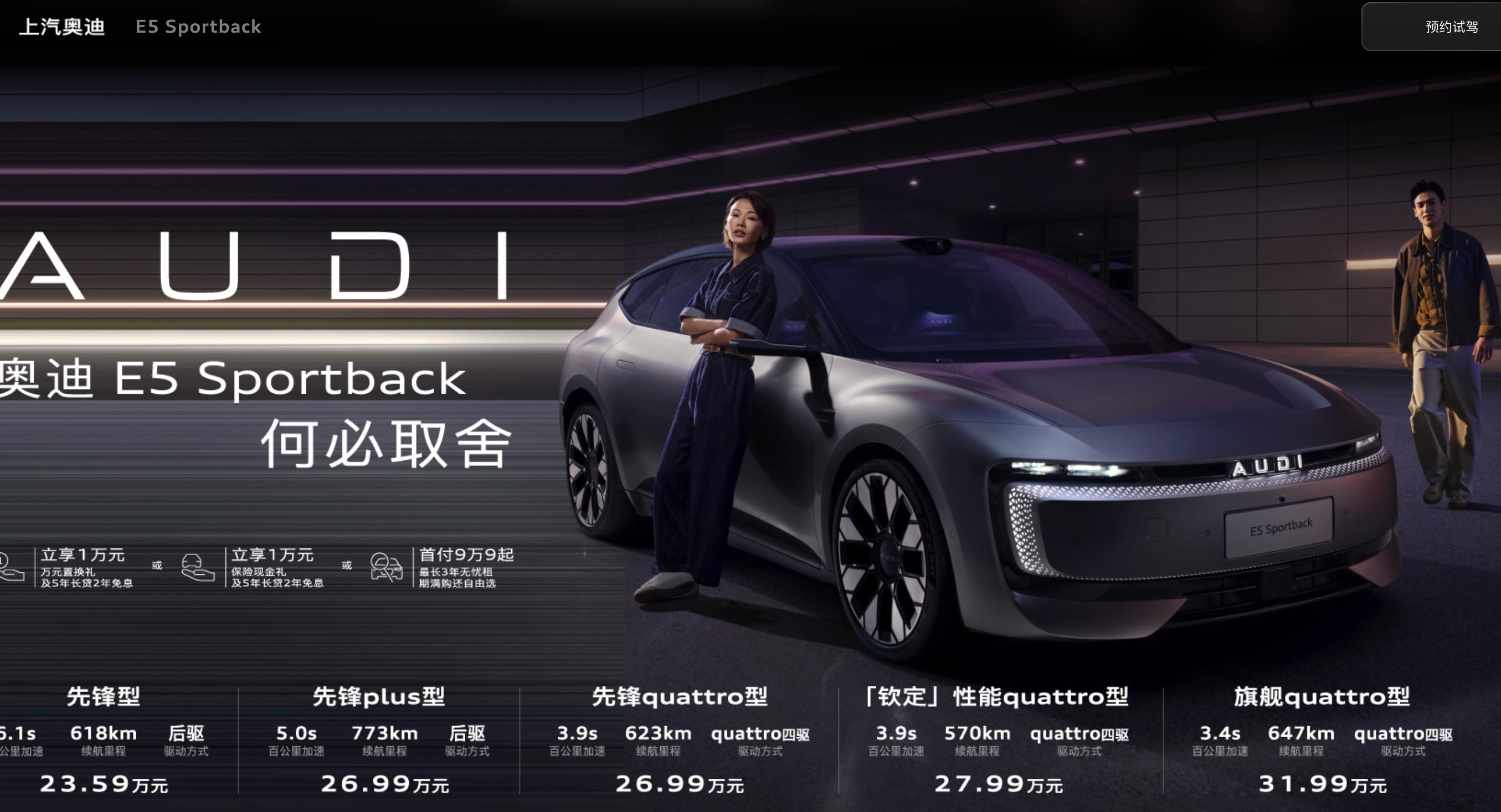 预算有限选先锋型(23.59 万):电子后视镜、虚拟座舱、L2 辅助驾驶都是标配,日常通勤完全够用,花小钱就能享到基础豪华感。优选先锋 quattro 型(26.99 万):比入门版多了四驱系统,操控质感提升明显,价格只贵 3 万多,性价比高。追求满配选旗舰 quattro 型(31.99 万):空气悬架、后桥转向、激光雷达辅助驾驶全配齐,适合预算充足、看重极致体验的玩家。总结:电动时代的奥迪味道还在奥迪 E5 Sportback 难得的是,没有为了电动化丢了品牌基因 —— 星钻光幕延续灯厂精髓,quattro 操控保持德系质感,Momenta 辅助驾驶又接地气。22 万起的价格,加上低至 8 分钱的每公里成本,让豪华纯电不再遥不可及。三个月销量稳步上涨的数据也证明,消费者对这种 “均衡无短板” 的产品是买账的。如果你想要一辆有品牌、好开、实用的纯电轿跑,这辆车确实值得放进试驾清单。