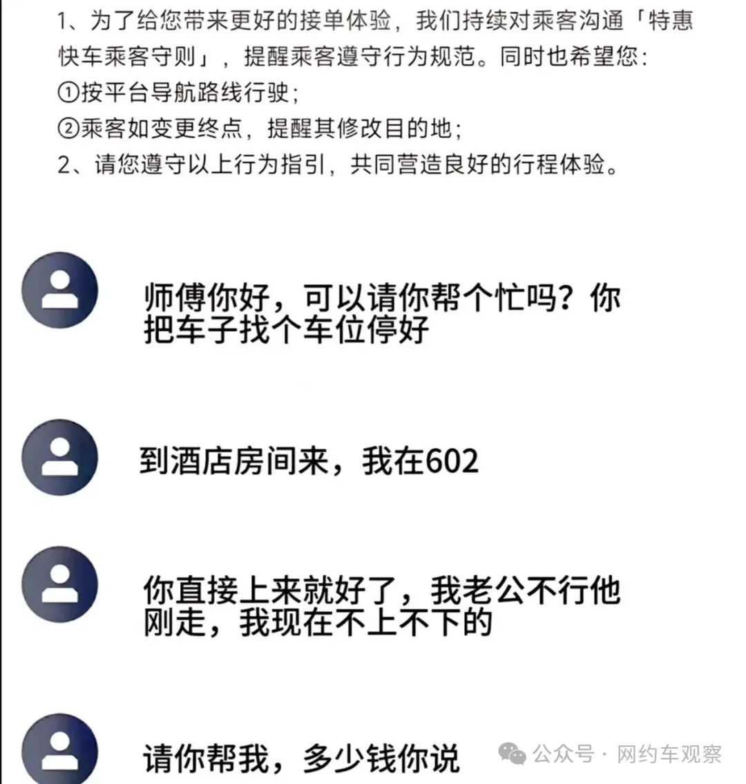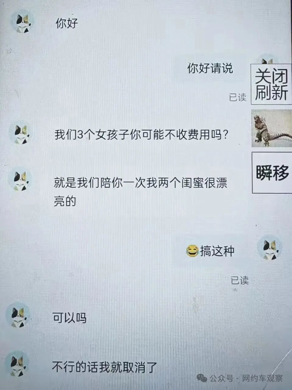 最近有司机师傅反馈自己在深夜接到了“桃色订单”。乘客还没上车就发来消息:你好,我们3个女孩子你可以不收费用吗?我们陪你一次。