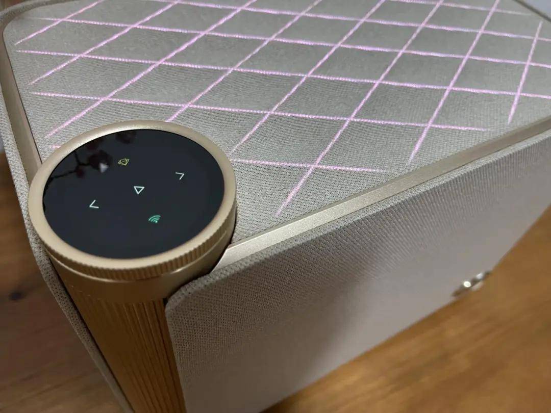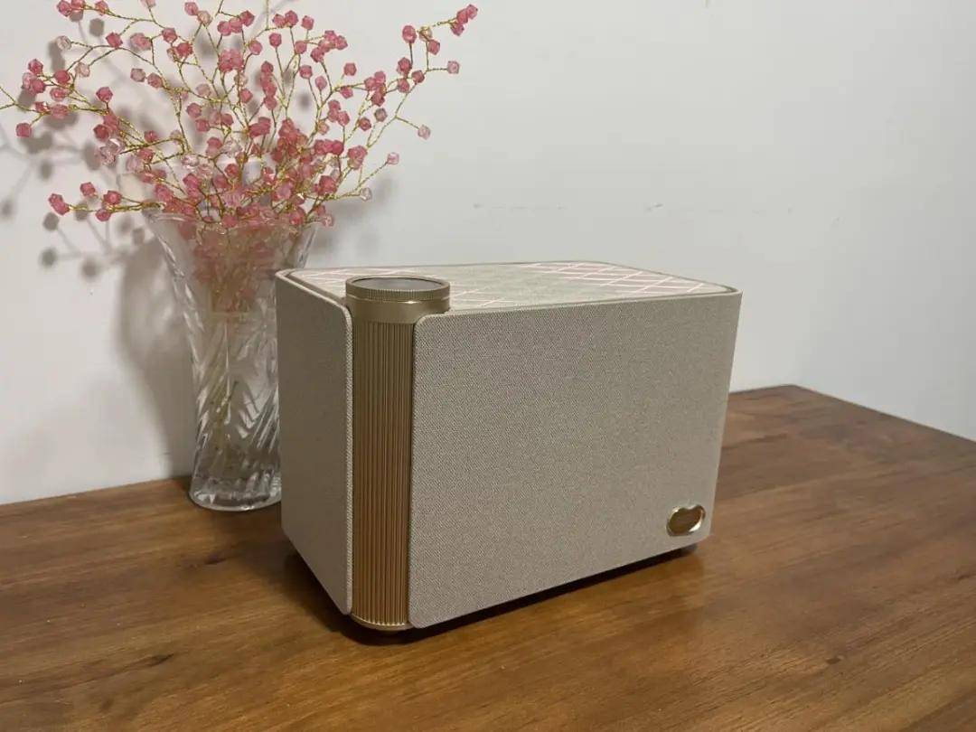 音箱整体是偏暖色系,外包了一层透声布,不管是看上去还是摸起来都很有质感,右下角一颗定制的QQ音乐联名logo,有点类似火漆封缄的感觉。