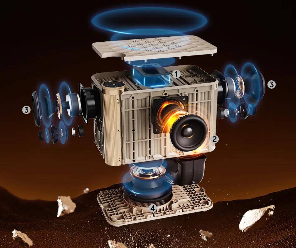 音箱两侧各有一对16mm丝膜球顶高音+2.5寸羊毛盆中低音单元,主要用来还原高保真立体声左右声道,自研专利音腔驻波抑制技术,减少声染色,音质更纯净。