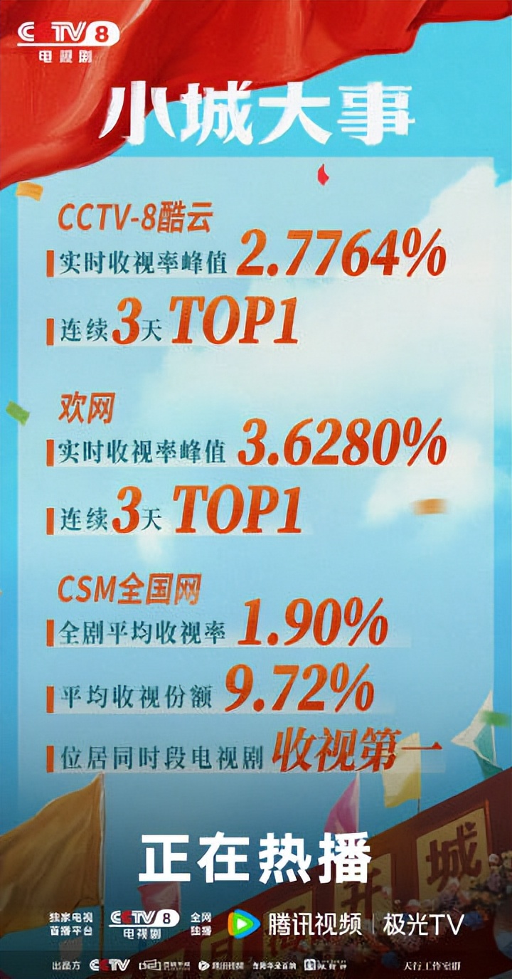 《小城大事》自1月10日开播后,便展现出强劲的收视势头。根据数据,其开播收视率一路攀升,仅播出5集后收视率已突破2.7%。在腾讯视频平台,剧集热度值开播不久便突破23000,成为当年站内达此热度最快的作品。