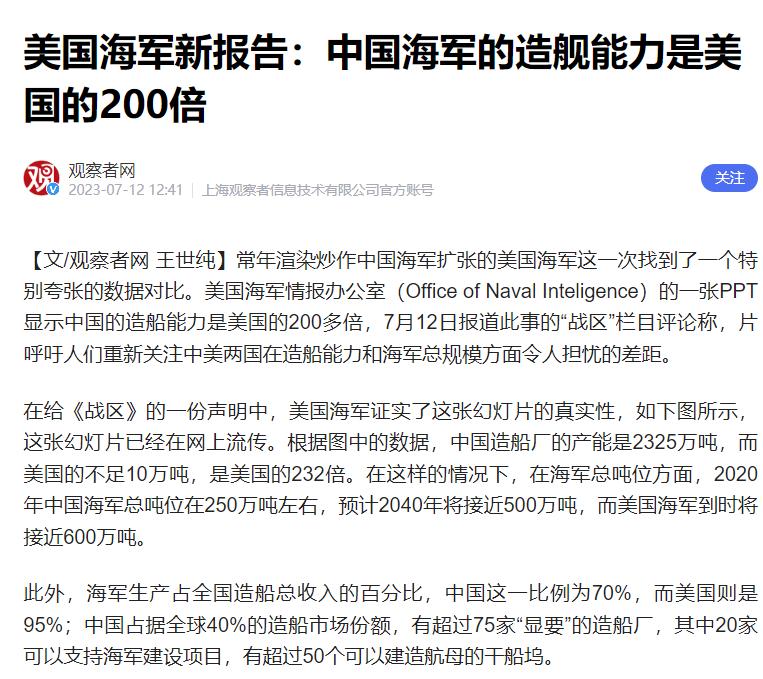 信息来源:美国海军新报告:中国海军的造舰能力是美国的200倍