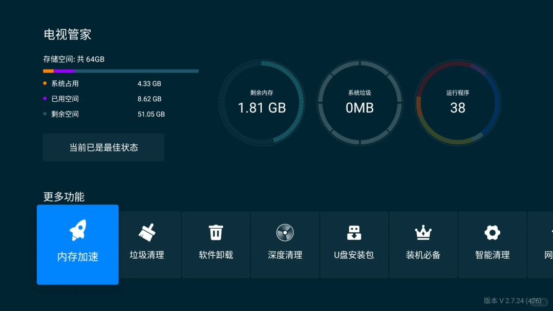 内存大一些的电视机,即使舍不得花钱开通VIP追剧观影,也可以下载各种APP,通过APP免费追剧、打游戏等,避免闲置。