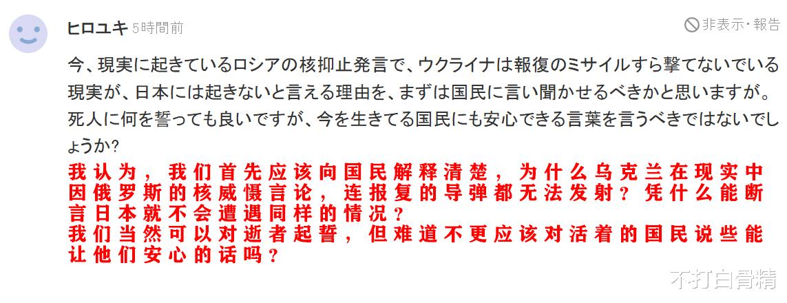 我们先来看一则为他辩护的贴文:乌克兰因为俄罗斯的核威慑,连报复的导弹都无法发射,日本不会遇到同样的情况吗?我们可以安抚死者,但更应该让活着的人安心。