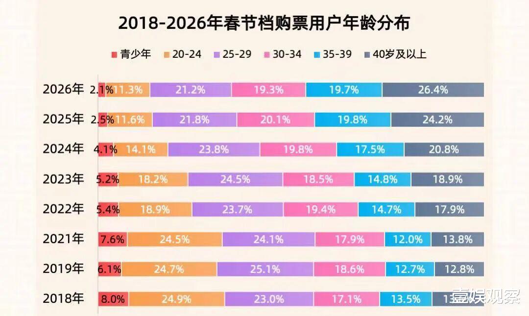 根据灯塔研究院发布的《2026春节档电影市场洞察报告》2018-2026春节档购票用户年龄分布显示,20-29岁人群占比逐年递减,而30岁以后人群在逐年递增,特别是40岁以上增速明显。其背后离不开社会老龄化问题,但也能发现同一批“中登”从2018年到2026年都没放弃走进春节档影院,而“中登”们对于“大众款”的导演与演员更有信任度。