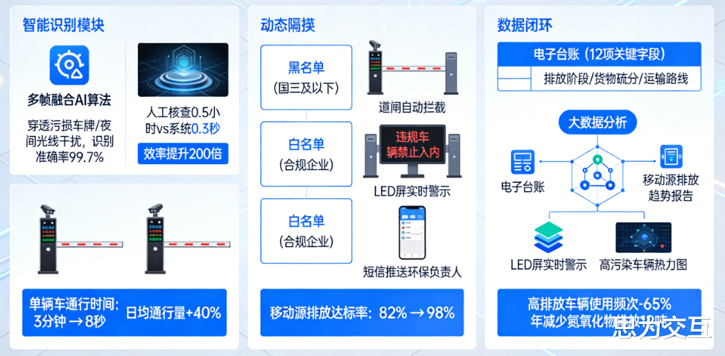 传统企业车辆管理依赖人工登记,存在三大痛点:一是效率低下,日均百辆次进出的企业需配备3—5名专职人员;二是数据失真,手写台账错误率高达15%;三是监管滞后,违规车辆入厂后难以追溯。环保门禁系统的出现,通过“硬件+算法+平台”的三重创新,实现了环保管控的范式跃迁。