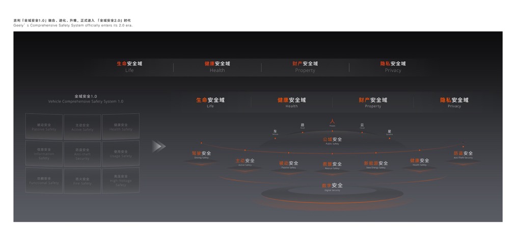作为行业安全技术的先行者与引领者,吉利在“全域AI”技术体系的赋能下,以“AI为纲 责任为本”,基于原有的“全域安全”技术体系进阶打造“全域安全2.0”技术体系。结合智能时代的安全新需求和新挑战,“全域安全2.0”技术体系秉持“以人为尊”理念,通过技术升级、能力突破与范式创新,将侧重“整车安全”的视角升级为“人-车-路-云-星”的生态视角,旨在贯穿用户出行全场景、覆盖出行全领域、联动出行全生态;并以“生命零伤亡、健康零危害、财产零损失、隐私零泄露”四大安全愿景为指引,逐步构建的一套为消费者提供全面的安全保障技术体系。