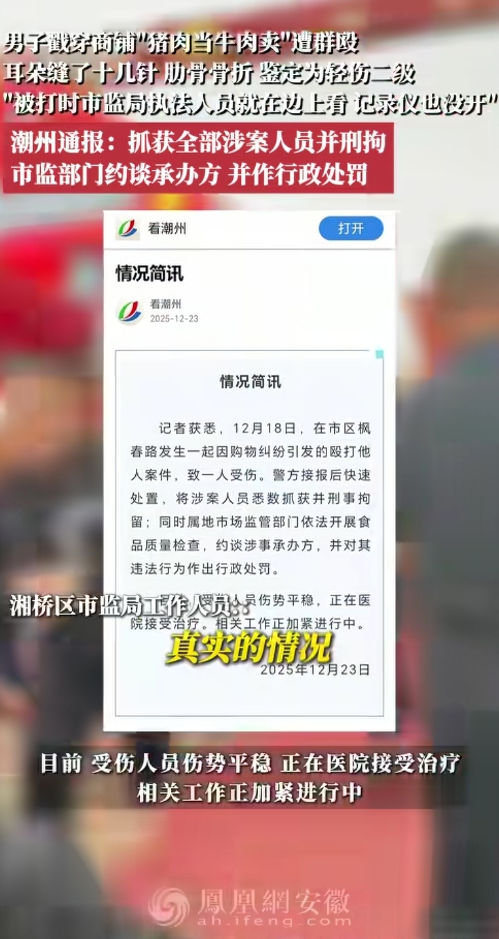 “看潮州”官方发布了情况简讯,系一起因购物纠纷引发的殴打他人案件。警方接报后迅速处置,将涉案人员悉数抓获并刑事拘留,同时属地市监部门依法开展食品质量检查,约谈涉事承办方,并对其违法行为做出行政处罚。