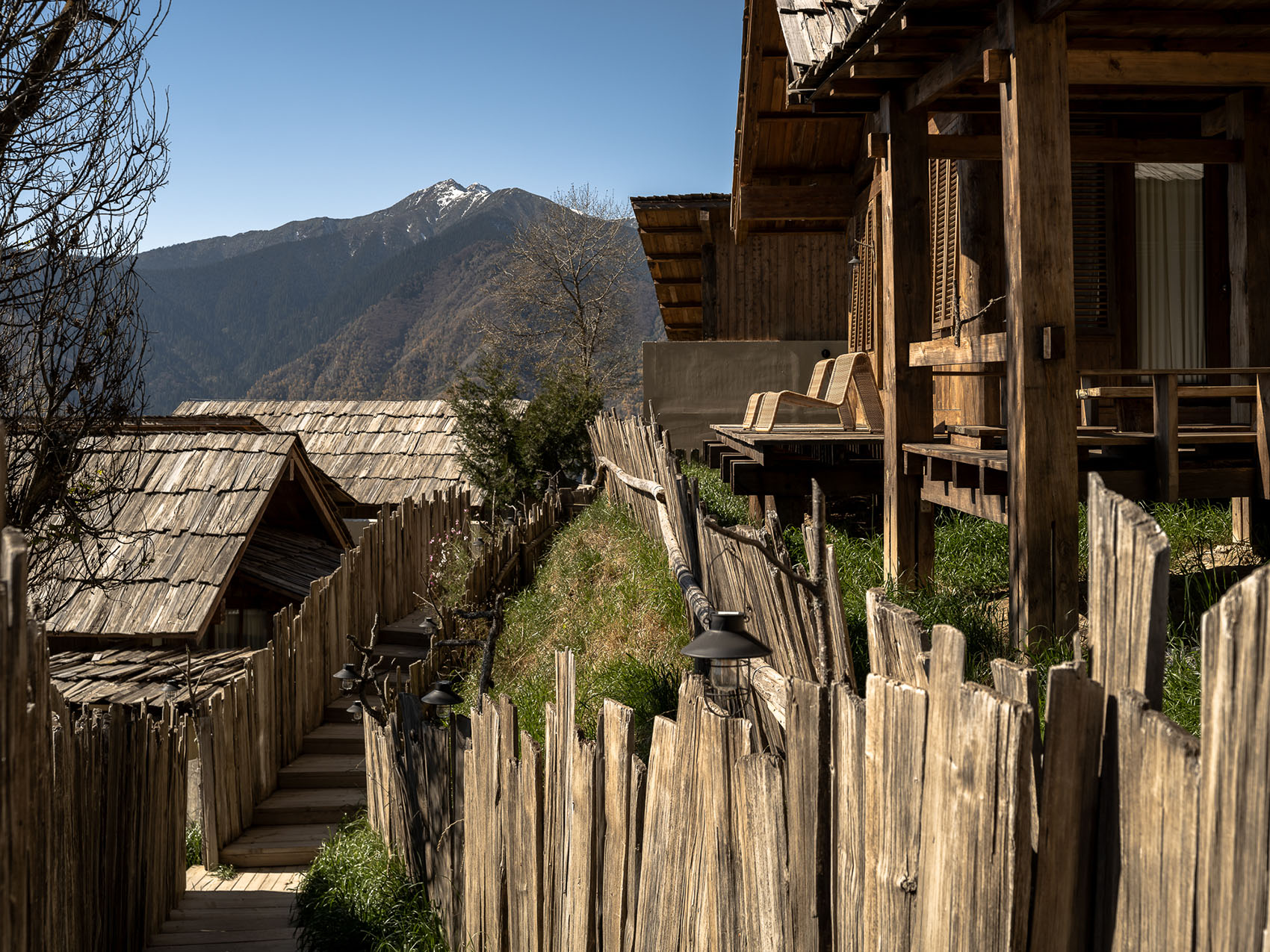 酒店客房设计成了独栋,把其拆分成四个组团,客厅、卧室、泡池、茶亭各居其位,建筑风格融入藏式民居元素,保留木拓瓦片,整个酒店散发着天然质朴的气息。享受多感官的、沉浸式的互动,让住客从一个被动的“观察者”转变为一个主动的“参与者”。