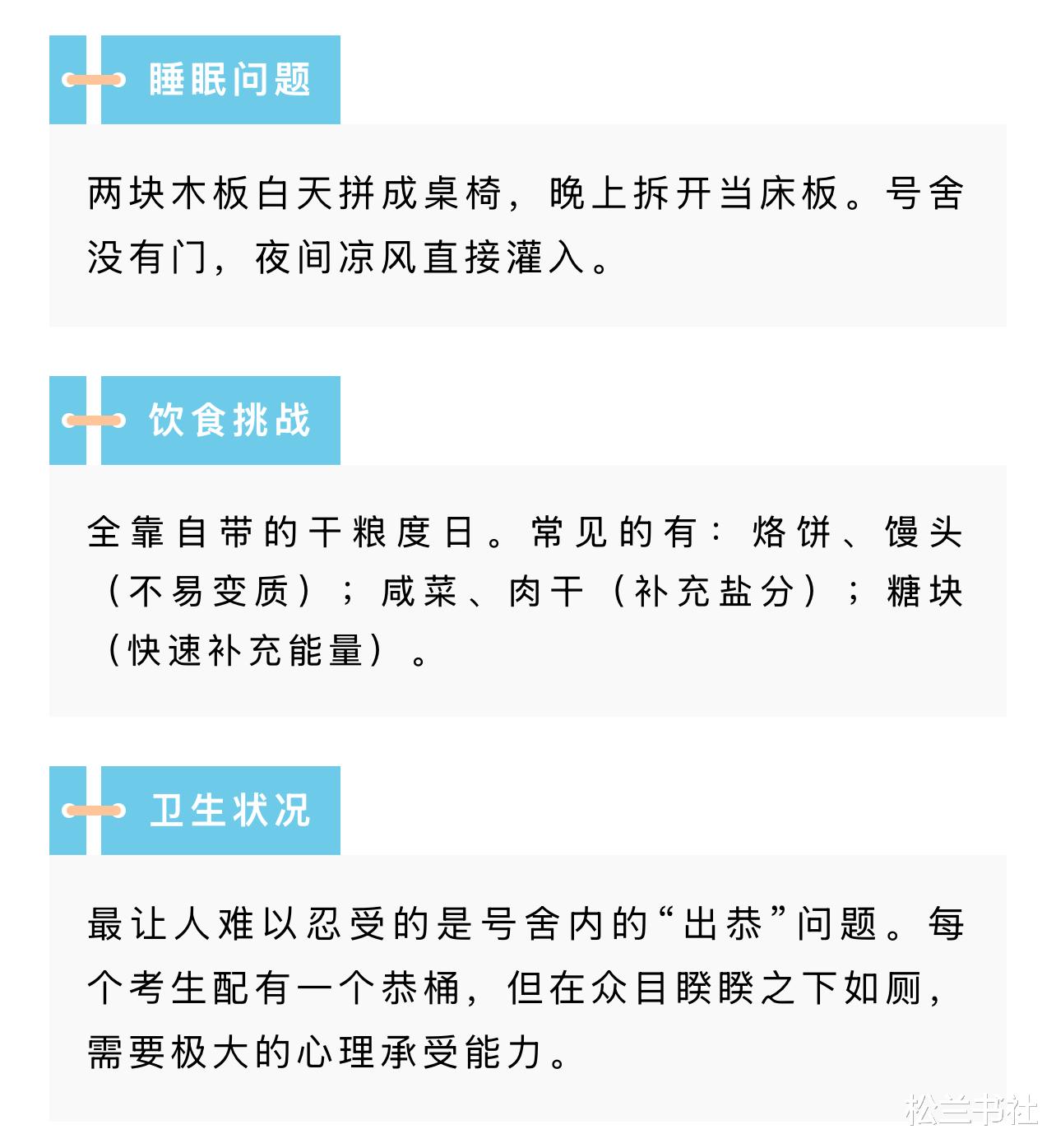 每排号舍尽头有号军值守,既维护秩序,也防止作弊。号舍没有门,完全开放,你要在众目睽睽之下完成所有考试和生活活动。