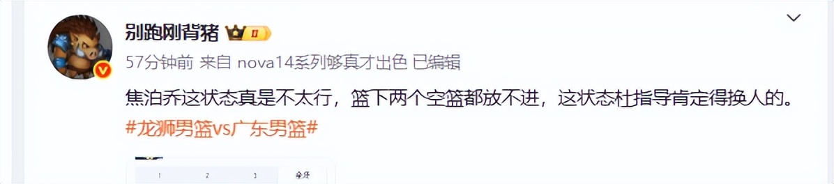 焦泊乔目前打过五场比赛,没有一场得分上双,场均4分,却有3.6次犯规,五场比赛累计犯规18次。除了会犯规,似乎不会做什么了,看来朱芳雨和杜锋主力引进他,真的是一个败笔,不但不如送走的徐昕,也不如球队本土内线。媒体人别跑刚背猪昨晚即时点评了焦泊乔,他说,“焦泊乔这状态真是不太行,篮下两个空篮都放不进,这状态杜指导肯定得换人的。”结果焦泊乔真的被弃用,是广东队内线球员中打的时间最少的人,如果不是王少杰早早背上较多的犯规,可能他昨晚是0出场,一秒钟也捞不到。王洪泽打了24分钟,王少杰打了17分钟,可见目前焦泊乔在广东队地位是多么低。