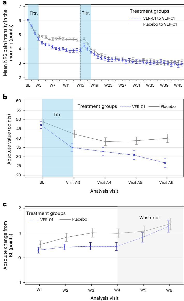 在为期12周的双盲治疗阶段,服用VER-01的患者报告其疼痛强度显著降低。虽然安慰剂组(服用无药效的油)也出现了所谓的“安慰剂效应”导致疼痛评分有所下降,但VER-01的效果明显更胜一筹。