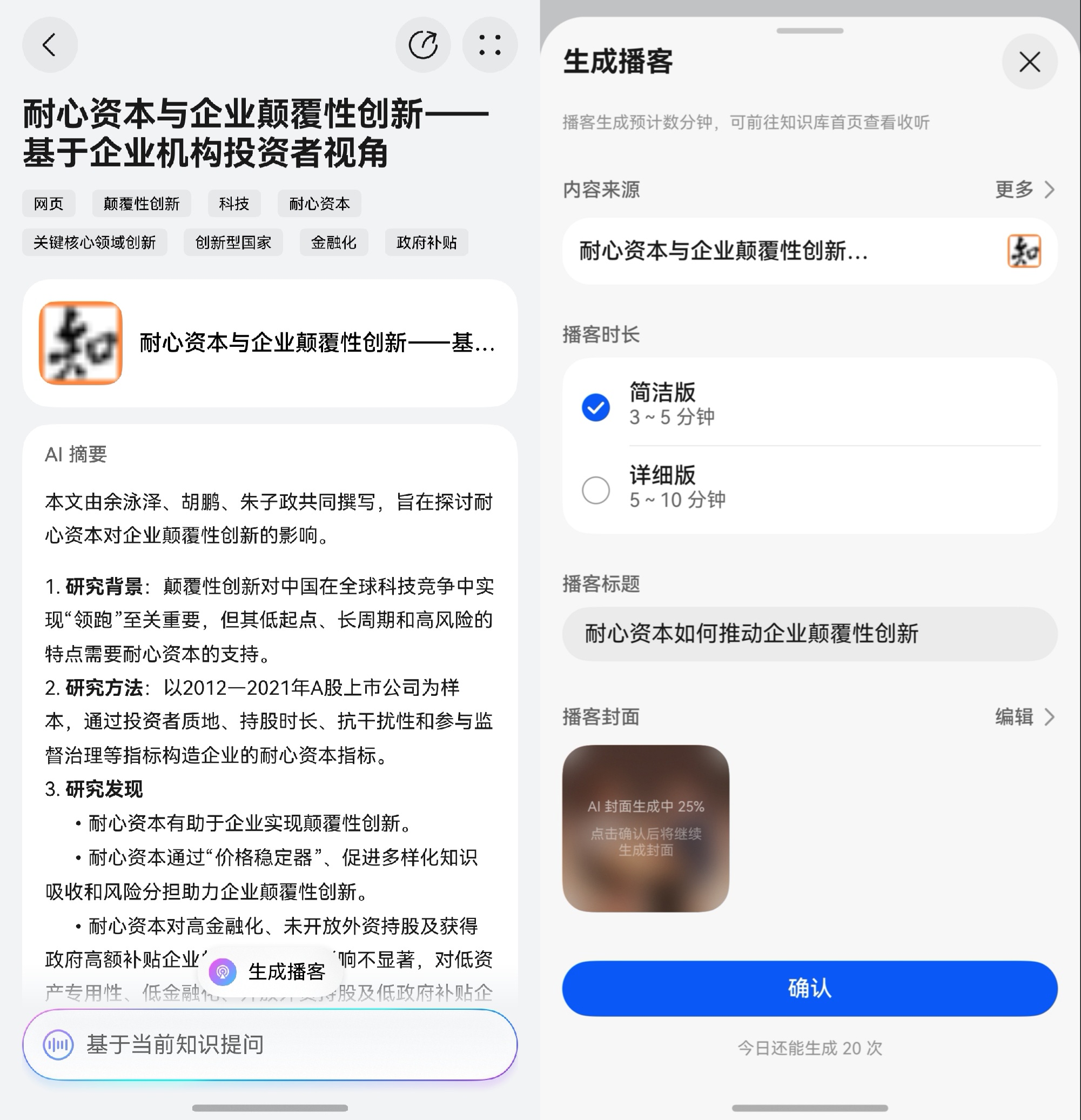 想了解行业动态又懒得看长文?小艺知识库还支持把文章快速生成AI播客,通勤路上、休息间隙随时听,行业干货不知不觉就get了~