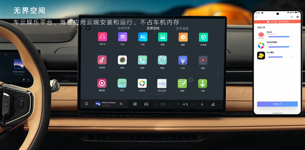 星耀8的科技突破,更深刻地体现在对“生态边界”的打破。其首创的“无界空间”车云娱乐平台,将应用的计算与存储能力部署于云端,使车机摆脱了本地硬件的物理限制,可无限扩展应用生态,甚至实现手机、车机间的会员权益与游戏进度无缝同步。通过“Ai银河手机精灵”,用户可直接在微信小程序中完成远程车控、车辆定位及状态查询,让科技服务融入最高频的社交工具,极致便捷。