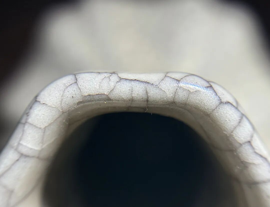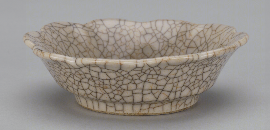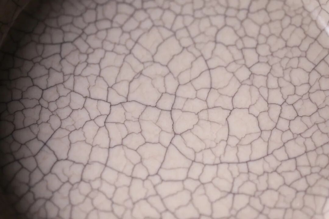 传世哥窑的开片极具审美趣味,开片不规则且细碎,而且开片一般呈弯曲不直状。开片有大有小,大开片呈灰黑色,小纹片呈土黄色,故有“金丝铁线”之称,为明清及后人所沉迷。