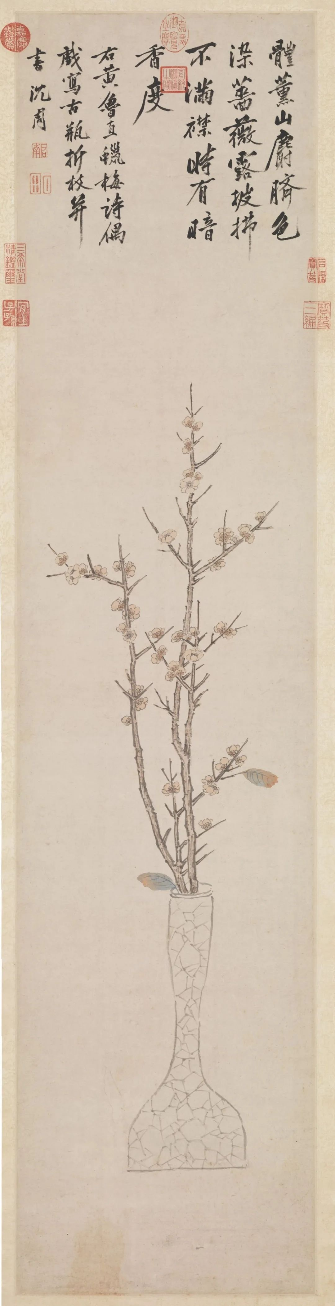 沈周是“吴门画派”的重要成员,“明四家”之一,他出生于宣德二年(1427),卒于正德四年(1509),此幅《瓶中蜡梅图》所绘“古瓶”为冰裂开片瓷器,例证文人审美趣味。