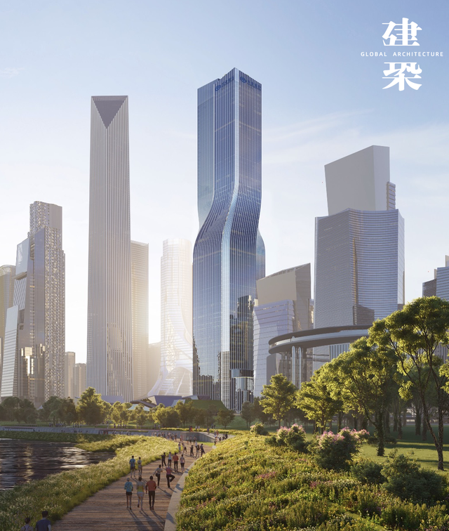 建筑底部三侧入口大堂采用无柱设计,三层挑高营造出通透开放的氛围,与塔身的扭转曲线互为映衬,共同构成一座刚柔相济的城市新地标。