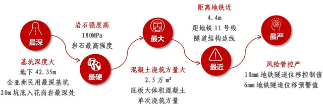 要知道,这座大楼的地下阶段曾因其“最深、最硬、最近、最大、最严”的施工难度备受关注,尤其42.35米深的基坑,被誉为亚洲民用建筑之最,推进之艰辛可想而知。