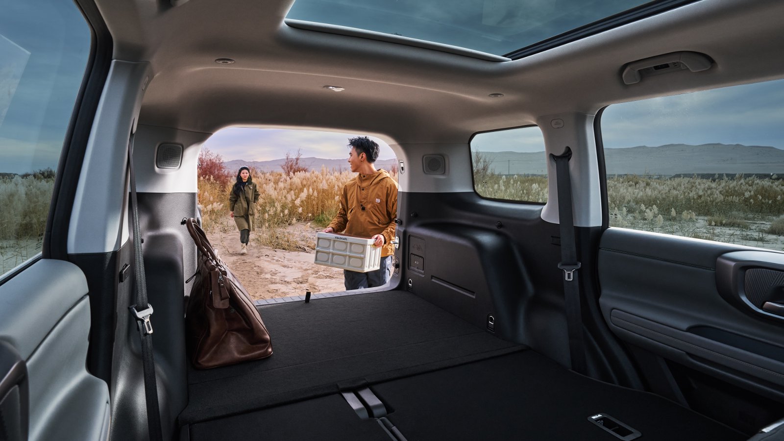 空间灵活性满足露营装备的多样需求。车辆的后备箱常规容积 532L,帐篷等都能轻松容纳。后排座椅纯平放倒后,扩展容积达 965L,可形成 1.7 米长的 “移动大床”,露营时能随时休息,也能容纳大件装备。车内丰富的处储物空间设计精巧,露营小物件各有归宿,保持车内整洁。