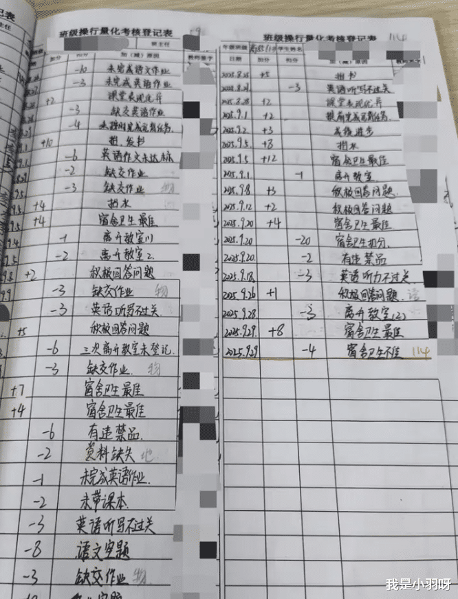 表格里的加减分项密密麻麻,如课堂表现优异 +2、积极回答问题 +5、抬书发书 +10;离开教室 -1、英语听写不过关 -3、作业空题 -10、宿舍卫生扣分 -20等。