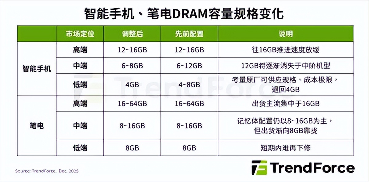 具体而言,原本以内存作为重要卖点的中低端手机或将受到严重影响,中端机常见的12GB内存配置将“逐渐消失”。