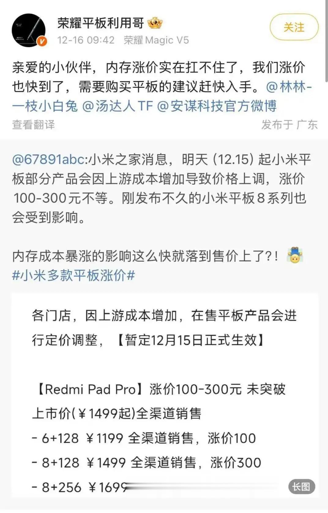 当下,部分小米在售平板电脑、荣耀平板电脑已官宣涨价消息,前者涨幅在100-300元不等。