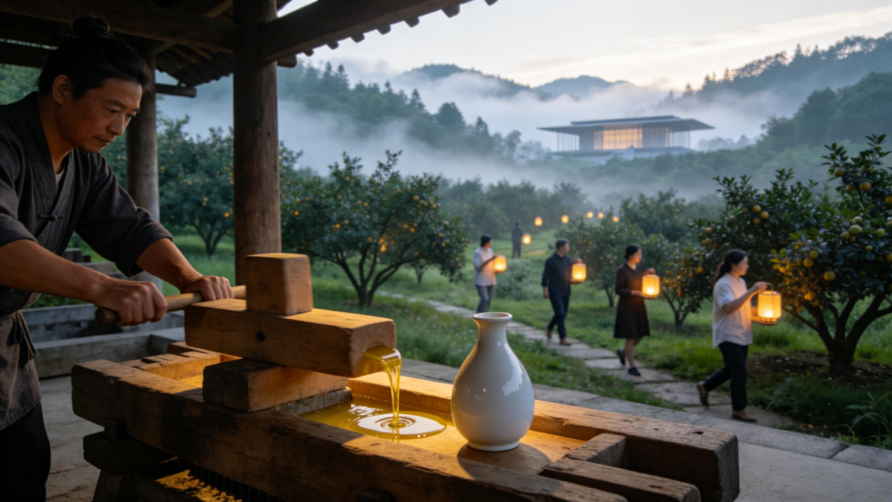 在工艺层面,古法木榨正在被重新发现。榨油工坊以手工、木榨、石磨的形式复原古代技艺,不仅保留了油的纯香,更重现了工艺的美感。木榨的节奏声、油流的光泽、空气中的温度,共同构成“工艺美”的现场体验。这不仅是生产过程,更是审美过程。