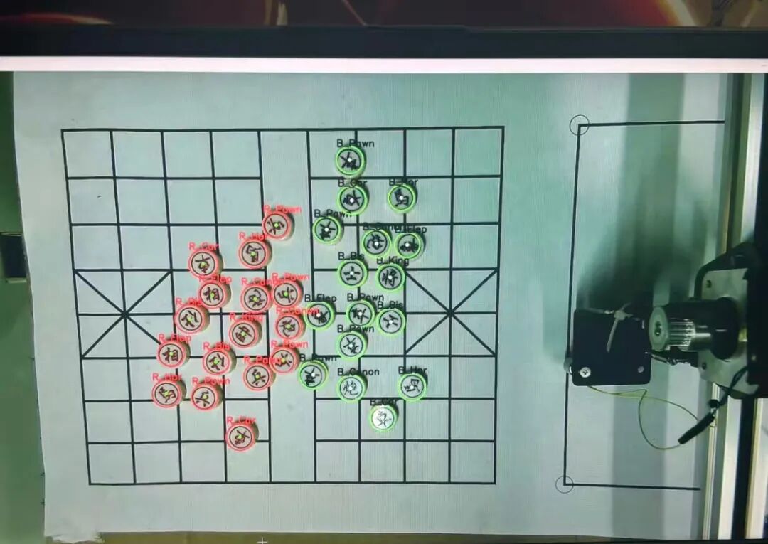 不过这个棋盘有点太粗犷了吧,感觉是自己用白纸打印的,看起来都像是半成品,给人一种不太靠谱的感觉,按理说精度是不如机械臂的,但实际效果居然还行: