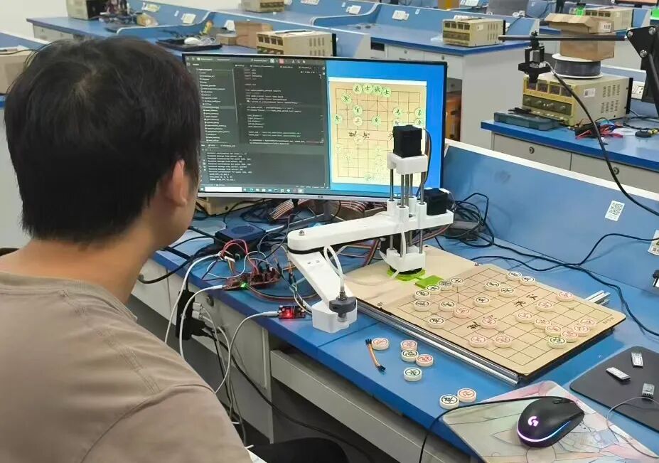 第一位大神不是一人,而是个小团队,他们用SCARA四轴机械臂和STM32主控,攒出了一个自带闭环控制系统的下棋机器人,支持在线编程和调试,可定制各种功能模块。