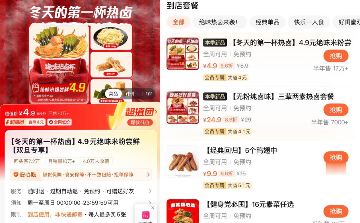 已经几年没光顾过绝味鸭脖的成林(化名),近期在朋友的推荐下,重新开始进店消费,打动他的,是绝味鸭脖11月17日上线的「热卤杯」。“一碗卤粉团购价才四块九,就算在小县城都算得上便宜,更何况是在北京这种一线城市。”
