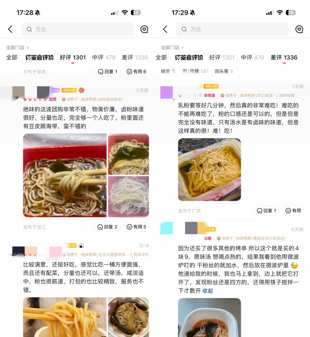 从抖音平台该团购的评价页面来看,截止12月18日17点28分,该套餐差评数1336条,超过1301条的好评数。而从大致内容来看,不同门店所处地区的消费水平及口味偏好、卤粉加热程度、店员服务态度等都是影响消费者评价的重要因素。