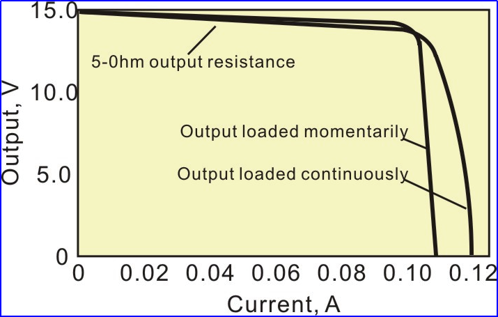 当负载超过了额定电流(0.1A),输出电压迅速下降