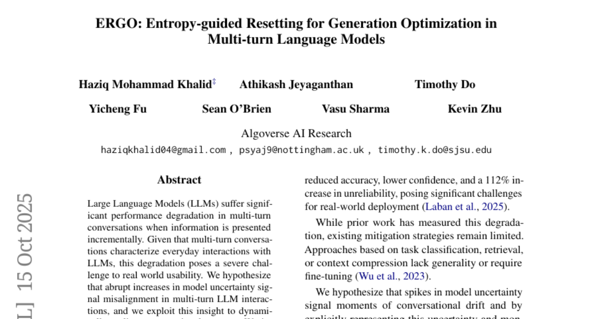 Algoverse AI研究团队的Haziq Mohammad Khalid、Athikash Jeyaganthan、Timothy Do等七位研究人员,在2025年10月发表了一项突破性研究,提出了名为ERGO(Entropy-guided Resetting for Generation Optimization,熵值引导的生成优化重置系统)的解决方案。这项研究发表在arXiv预印本平台,编号为arXiv:2510.14077v1,专门解决大语言模型在多轮对话中性能急剧下降的问题。