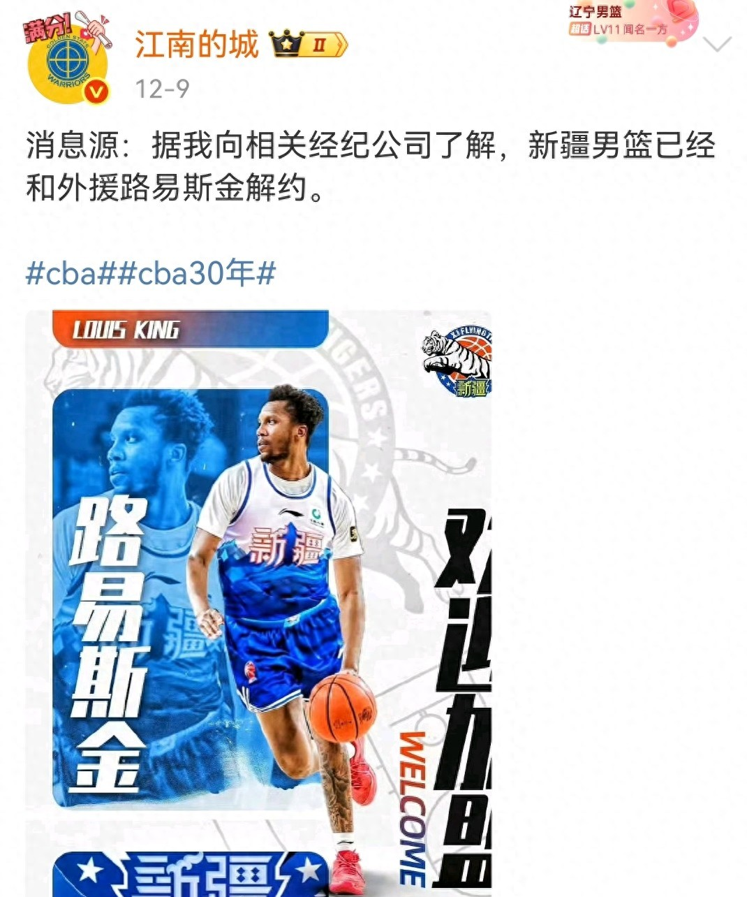 12月9日据媒体人江南的城爆料,新疆男篮正式裁掉了,本赛季新签外援路易斯金。这名球员也成为了,CBA新赛季首位被裁掉的外援。准确来讲12月9日新赛季还没有开始,球队就已经裁掉了他。