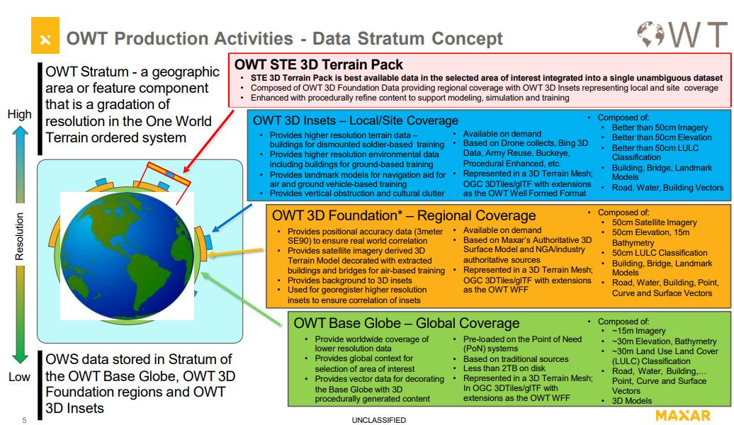 值得注意的是,“一个世界地形”提供全球三维地形相关能力和服务,可供所有模拟训练器使用,这些训练器能够模拟多域作战环境的复杂性,支持“综合训练环境”。“一个世界地形”重点关注数据而非工具,其数据存储在一个名为3D地形包的数据集中,包括三个级别的地形数据,分别是3D插入数据(提供局部和具体站点覆盖能力)、3D基础数据(提供区域覆盖能力)和全球基础数据(覆盖全球)。