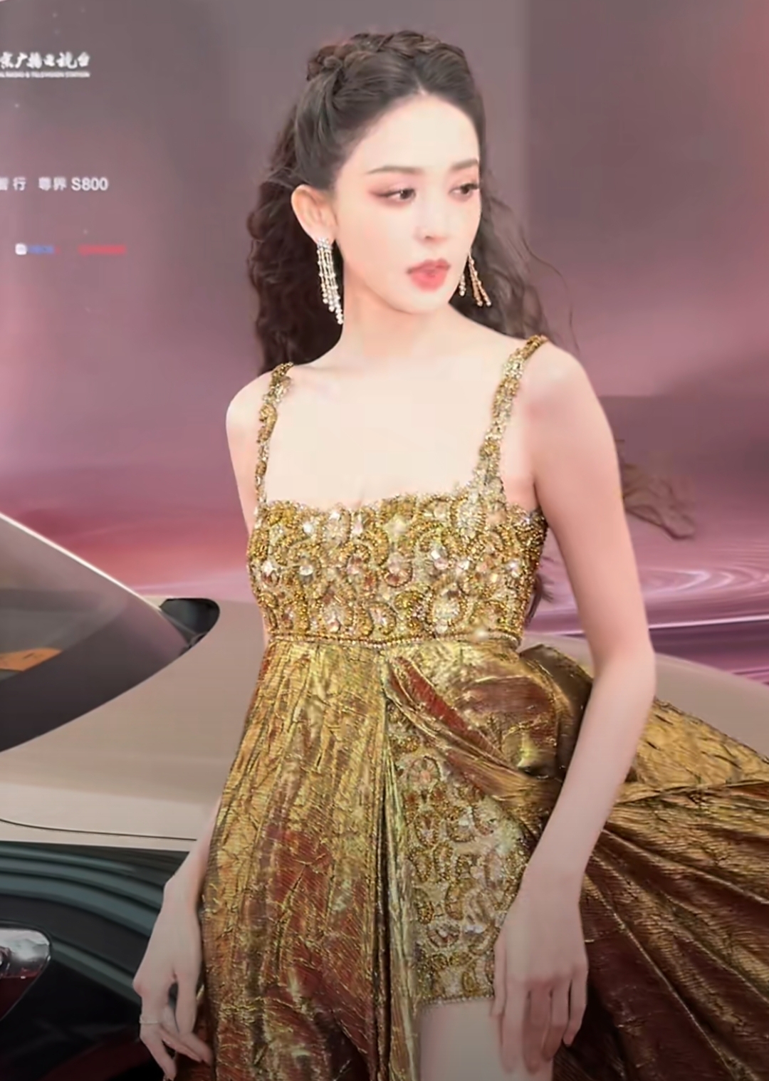 从颜值角度来看,娜扎的五官本就极具辨识度,深邃的眼眸、高挺的鼻梁、精致的唇形,组合成一张极具异域风情的面容。当晚的妆容选择了与礼服相呼应的金棕色调,眼妆深邃有神,唇色自然饱满,发型则是简洁大气的盘发造型,将视觉焦点完全集中在她的面部轮廓和颈部线条上。这种"做减法"的妆发思路反而更凸显了她骨相的优越,整个人散发出一种不食人间烟火的神性美感。