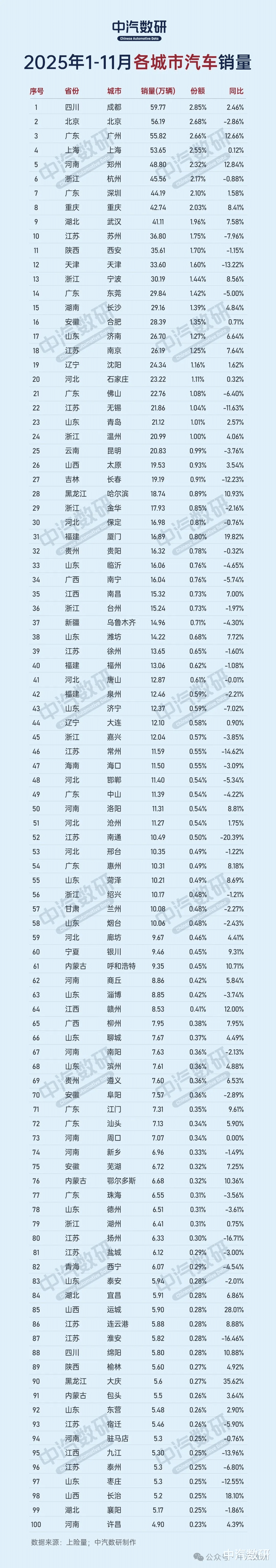 以下是2025年1-11月中国各大城市汽车累计销量TOP100: