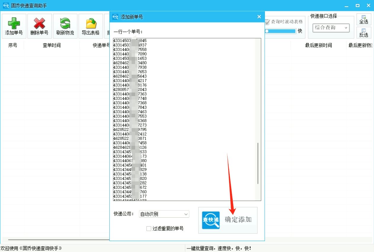 固乔快递批量查询助手:操作极简易上手,新手5分钟就能熟练掌握。教程要点:登录后点击“添加单号”,可复制粘贴批量录入或上传Excel/TXT表格,系统自动识别快递公司,勾选“过滤重复单号”点击确认;查询完成后直接点“导出表格”,选择XLS/CSV等格式即可生成可编辑文件,全程无冗余步骤。