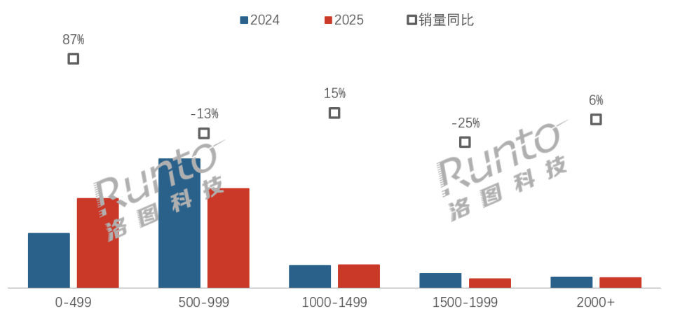此外,500-999元及1500-1999元价位段的销量出现了较大幅度的下滑,说明市场需求正逐渐向极致性价比与高品质体验两端集聚。
