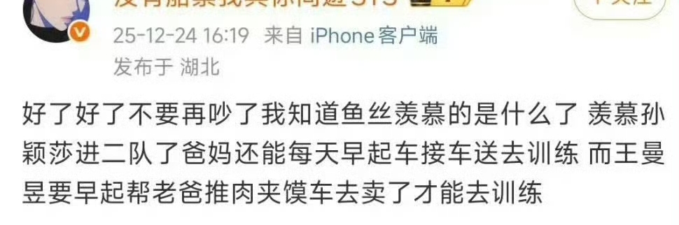 没想到,如今已经是2025年末,还有极端饭圈粉丝用王曼昱的家庭出身,父母工作,极力拉踩侮辱奥运冠军王曼昱!